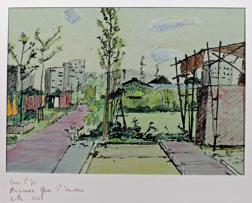 Lille, Cours Saint So, ancienne gare Saint Sauveur, 20 x 30 cm, encre de Chine avec calame et crayons de couleur