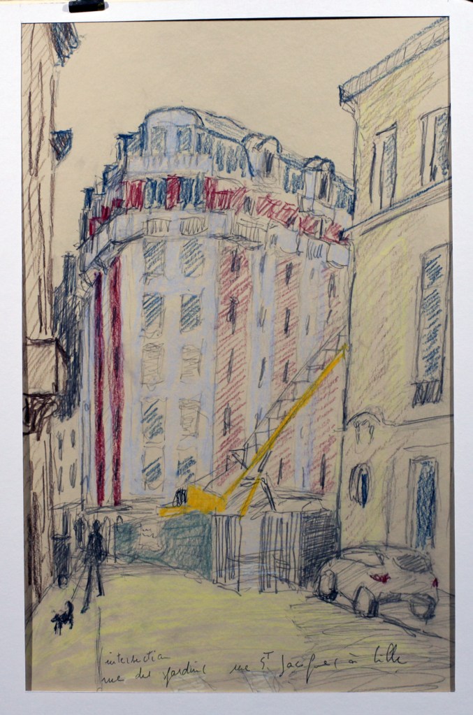 Lille, intersection des rues des jardins et Saint Jacques, 37 x 24 cm, crayon mine de plomb et crayons de couleur