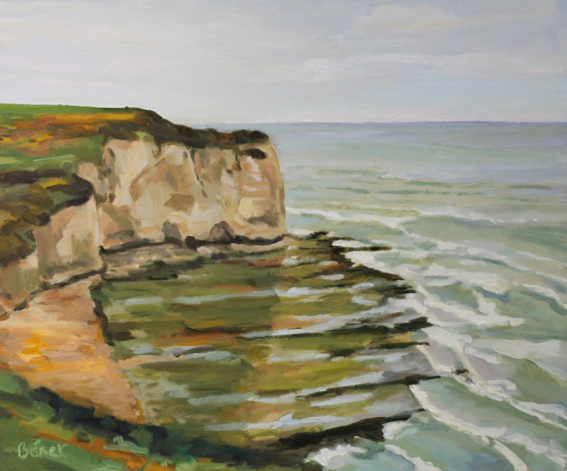 La falaise d’Etretat est particulièrement célèbre et a été peinte fréquemment. Ici j’ai essayé de la représenter à partir d’une photo ancienne (que je date entre 1870 et 1910). Les bateaux de pêches étaient hissés sur la plage de galets à l’aide de cabestans positionnés en amont.