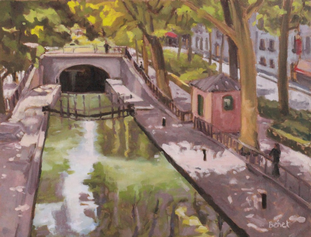 Pourquoi un tableau de la place de la Bastille dans l’article sur le canal Saint Martin? Parce que c’est là que le canal commence , par une partie couverte qui court sous les boulevards Richard Lenoir puis Jules Ferry. Le canal réapparait à l’air libre au niveau de la rue du Faubourg du temple, puis continue vers le nord, bordé par les quais de Jemmapes et de Valmy.