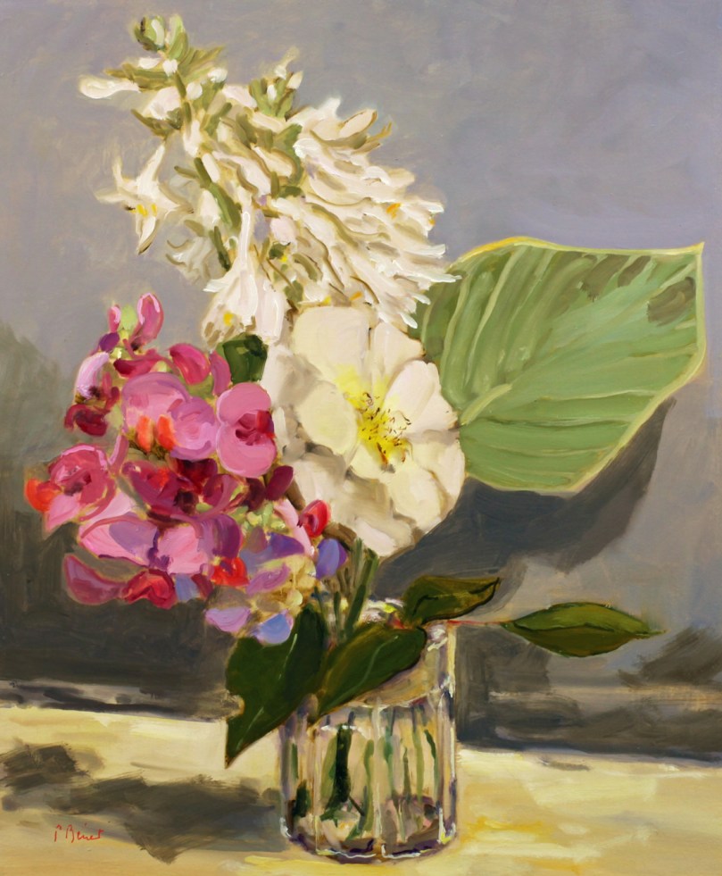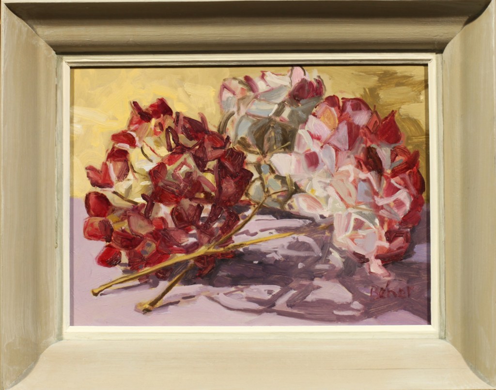 Bon, continuons dans les natures mortes pour peindre d’après le motif en atelier… Après la famille nounours, ce petit tableau en jouant avec des fleurs fanées d’hortensias.