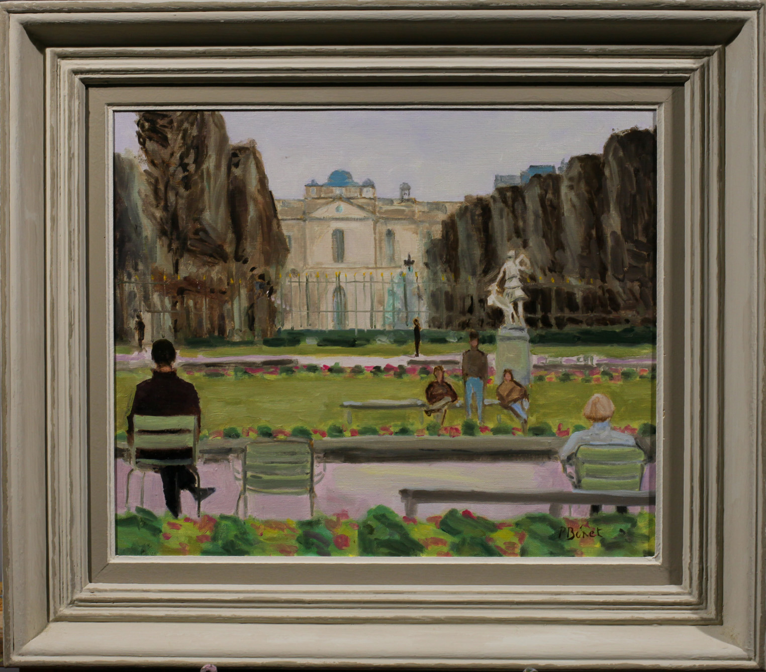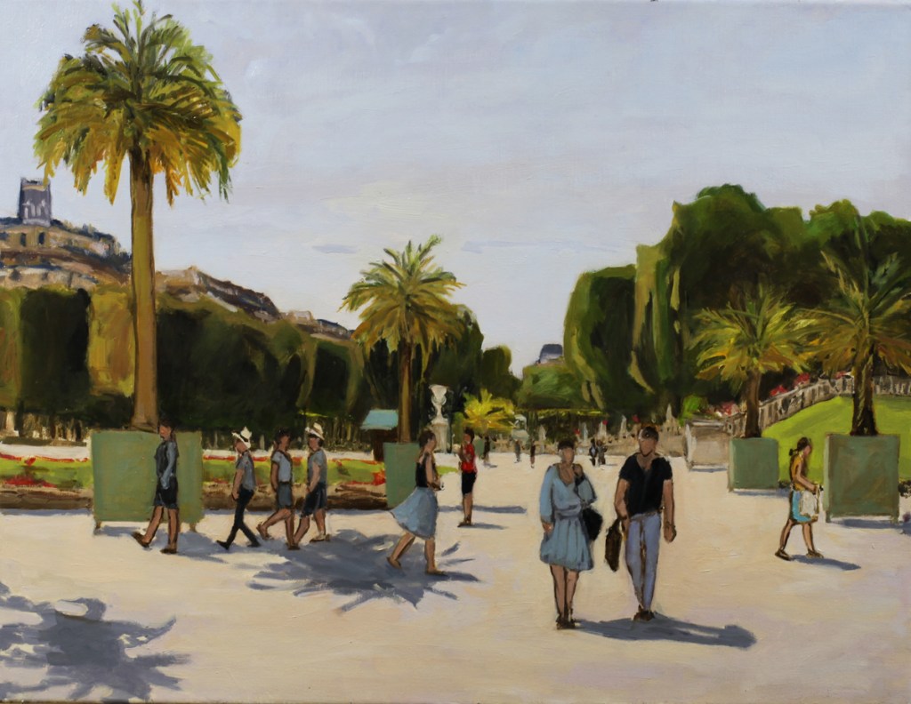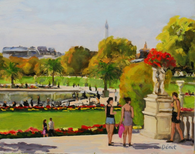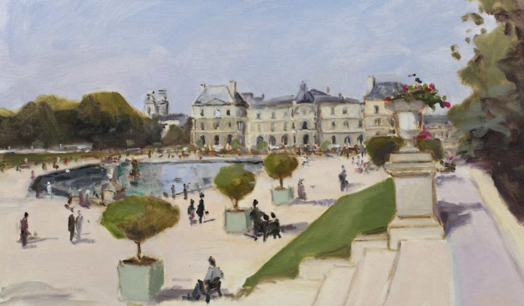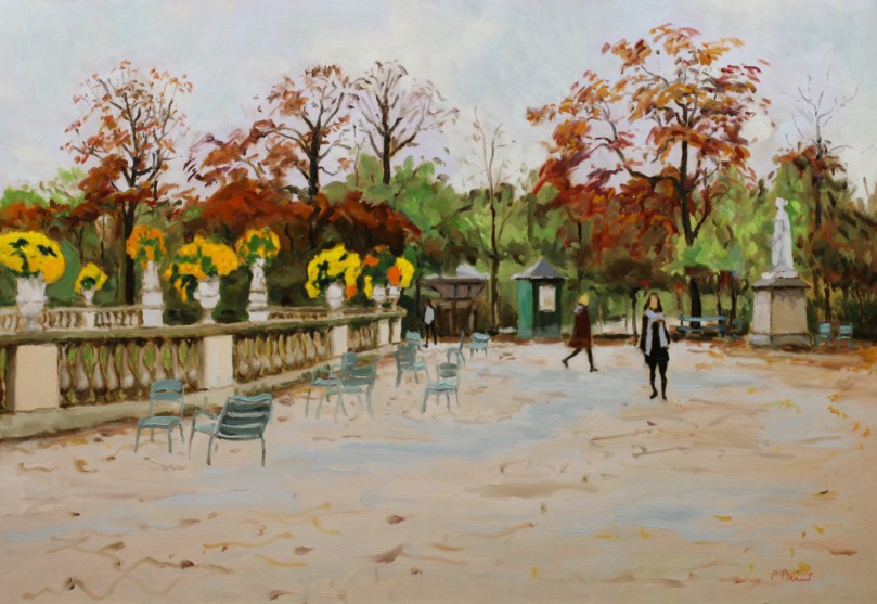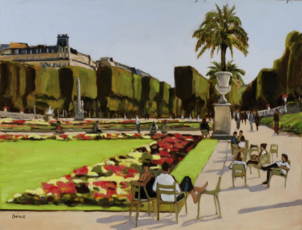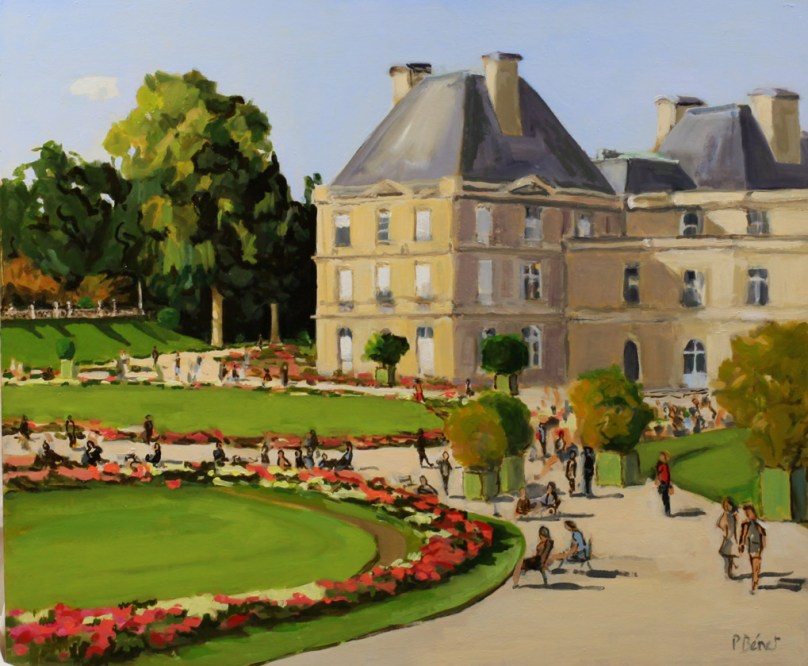 J’aime beaucoup le jardin du Luxembourg. C’est le jardin de l’enfance de ma femme, moi-même, j’y suis allé enfant, étudiant, puis plus tard nous y sommes allés avec enfants puis petits-enfants. Non seulement le jardin est beau, mais il est grand, très fleuri, et c’est un spectacle permanent. On en ressort les chaussures couvertes de la poussière blanche de ses allées sablées. j’ai fait plusieurs peintures de ce jardin. De plus on peut y jouer aux échecs tous les après-midis, pour moi tentation permanente… Actuellement avec le confinement, je ne peins plus et passe mes journées à jouer aux échecs sur internet avec des joueurs de la terre entière!
