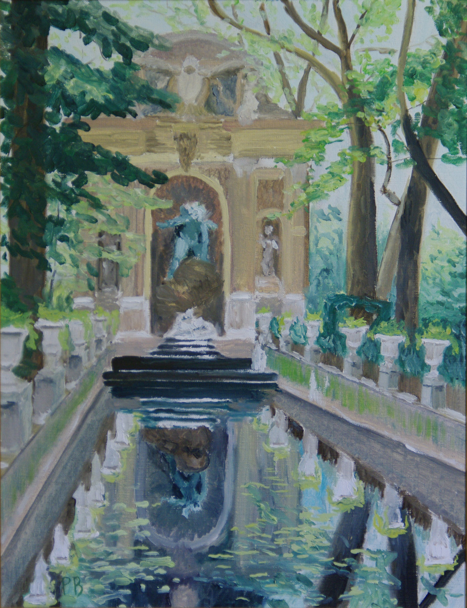 Présentation de l’œuvre: Une vue bien connue du jardin du Luxembourg où l’on voit le dôme du Panthéon dans l’alignement du bassin.