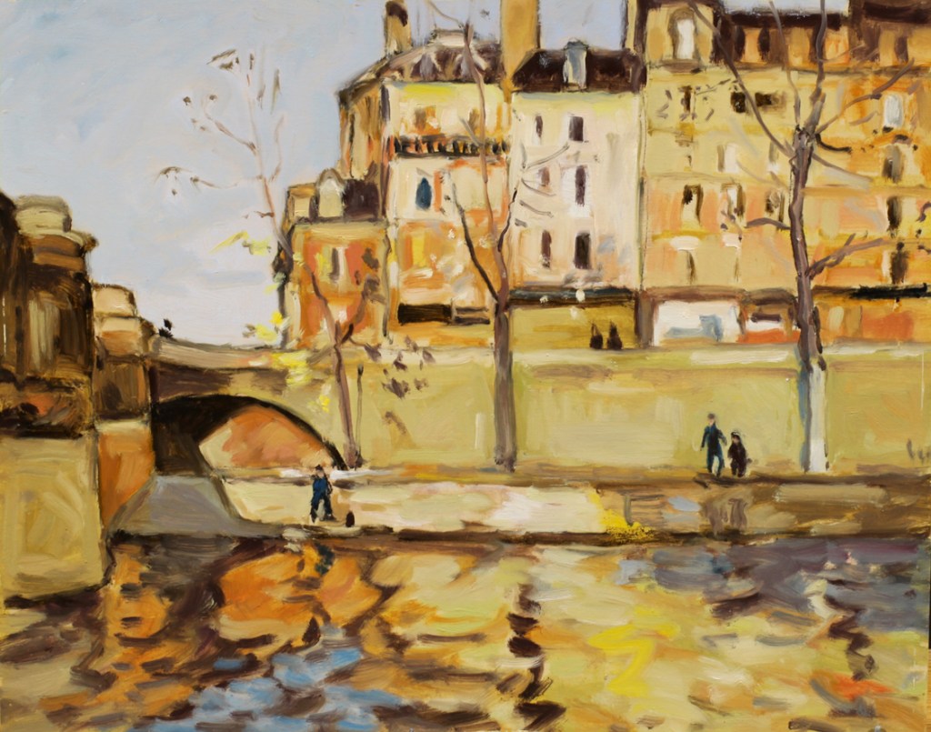 J’ai toujours trouvé que la neige à Paris avait un air de fête, et c’est je crois un sentiment partagé par ces promeneurs sur le champ de Mars. (J’avais chiné ce grand cadre doré, et j’ai peint ensuite un tableau qui pouvait s’accorder au cadre) Mais l’ambiance est plus froide pour cette vue de la Seine au Pont Marie