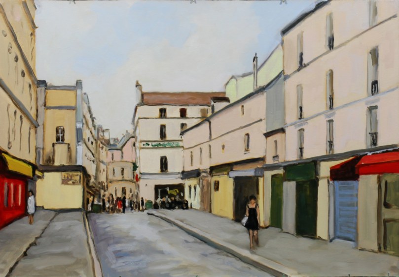 Elle fait partie de mes itinéraires habituels et j’aime la représenter. Dans le haut de la rue, l’ambiance est plutôt étudiante avec restaurants et bars (dont autrefois le café « aux 4 S », référence aux quatre sergents de la Rochelle, où nous faisions des parties de baby-foot). La place de la Contrescarpe a été récemment réaménagée.
